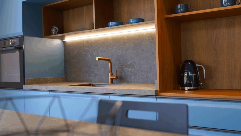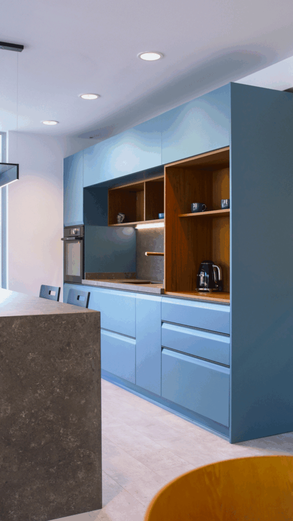 The blue tone chosen for the fronts does not go unnoticed. It brings freshness, personality and a unique identity to the environment. It is a colour that conveys calm and sophistication, and when applied to large surfaces, it becomes the common thread of the design. Its presence creates an enveloping and modern effect that breaks with convention without losing elegance.